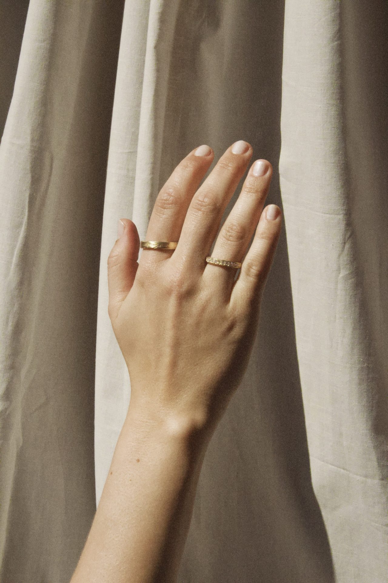 A wedding collection inspired by dunes, formed by sand over time. Every piece of jewelry of the collection is created with pouring hot gold in red clay sand, therefore every piece has it own unique raw structure.